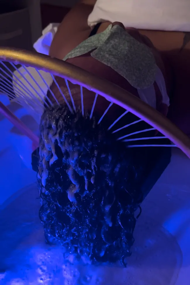 Customized scalp detox experience involving an in- depth scalp analysis, detoxing and nourishing hair and scalp products, stimulating massage tools and techniques, high frequency combing, acupressure therapy, deep conditioning treatment, dandruff removal, upper body hot stone massage, vagus nerve stimulation, heated eye mask, sound bath experience, aromatherapy and a blowout to finish the experience.